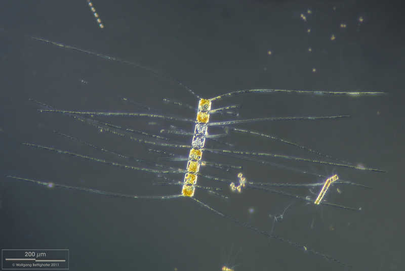 Man beachte, dass die Schwebefortsätze Protoplasma und sogar Chloroplasten enthalten. Multiebenen-Abbildung, manuell gestapelt. Der Messbalken markiert eine Länge von 200 µm. Probe aus der Nordsee vor Helgoland in der Zeit der Frühjahrsblüte. Mikrotechnik: Zeiss Universal, Kamera: Olympus C7070.Creative Commons License V 3.0 (CC BY-NC-SA).