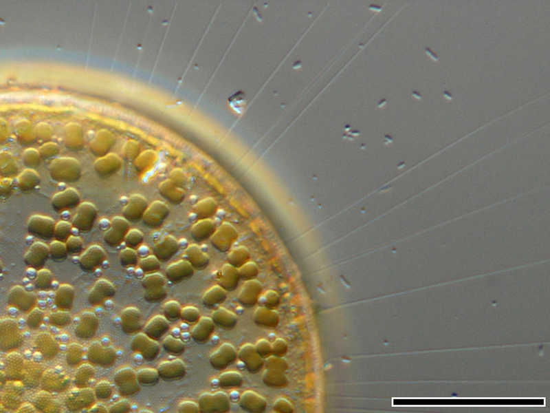 The image shows numerous chitinous spines which minimize their sedimentation speed. Scale bar indicates 25 µm. The image was built up using several photomicrographic frames with manual stacking technique.