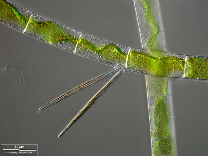Synonym: Fragilaria ulna.Aufwuchs on Mougeotia. The scale bar indicates 50 µm. The specimen was gathered in the wetlands of national park Unteres Odertal (100 km north east of Berlin). The image was built up using several photomicrographic frames with manual stacking technique. Images were taken using Zeiss Universal with Olympus C7070 CCD camera. Image under Creative Commons License V 3.0 (CC BY-NC-SA).