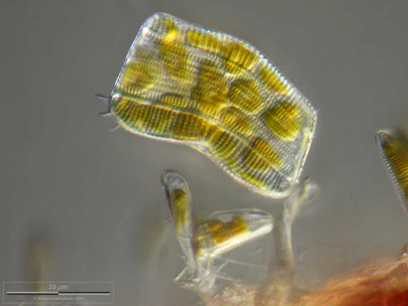 Eine Zelle auf einem Gallertstiel. Multiebenen-Abbildung aus 18 Fotos, manuell gestapelt. Der Messbalken markiert eine Länge von 25 µm. Probe aus dem Hiddenseer Bodden. Mikrotechnik: Zeiss Universal, Kamera: Olympus C7070.Creative Commons License V 3.0 (CC BY-NC-SA).