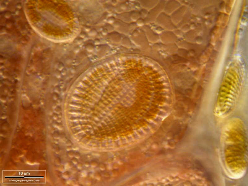A habitat of Cocconeis scutellum on the red alga Polysiphonia. Scale bar indicates 10 µm. Collected from Bodden, the brackish waters lying between the isles of Hiddensee and Ruegen (German Baltic Sea). This image was taken using Zeiss Universal with Olympus C7070 CCD camera. Image under Creative Commons License V 3.0 (CC BY-NC-SA).