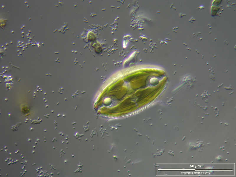 Multiebenen-Abbildung, manuell gestapelt. Der Messbalken markiert eine Länge von 50 µm. Probe aus dem Hiddenseer Bodden. Datum der Aufsammlung: 7/2012. Mikrotechnik: Zeiss Standard, Kamera: Olympus OM-D M5 MKII. Creative Commons License V 3.0 (CC BY-NC-SA).