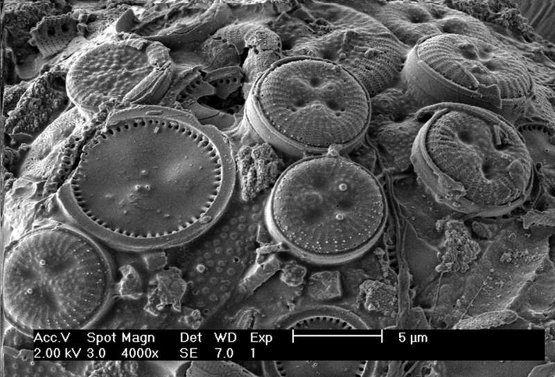 Frustules mounted on a lorica from ciliate Codonella crater gathered in the lake Schierensee near Kiel, Germany5/2004). Use of SEM equipment courtesy of Lab Dr. Karl-Heinz Schäffner, Solingen, Germany.
