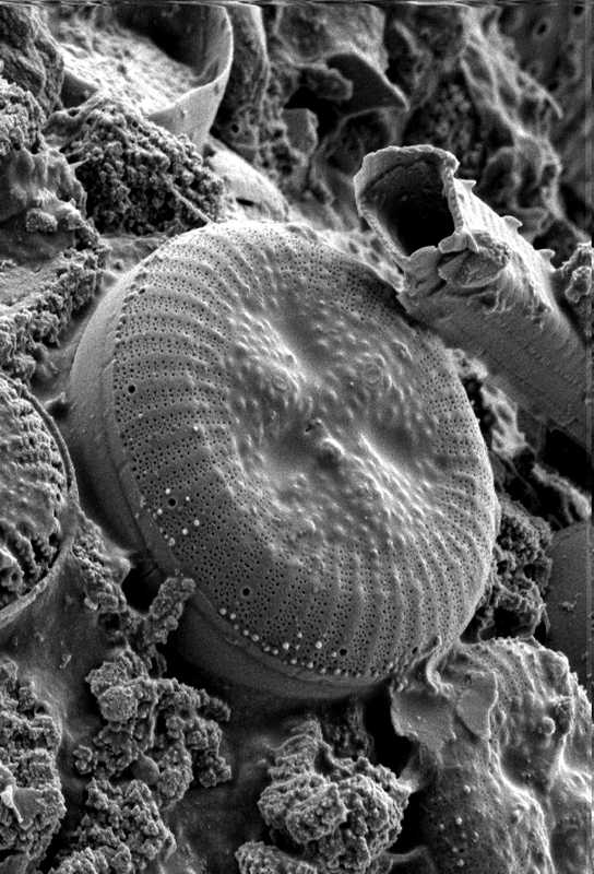 Frustules mounted on a lorica from ciliate Codonella crater gathered in the lake Schierensee near Kiel, Germany5/2004). Use of SEM equipment courtesy of Lab Dr. Karl-Heinz Schäffner, Solingen, Germany.Image under Creative Commons License V 3.0 (CC BY-NC-SA).
