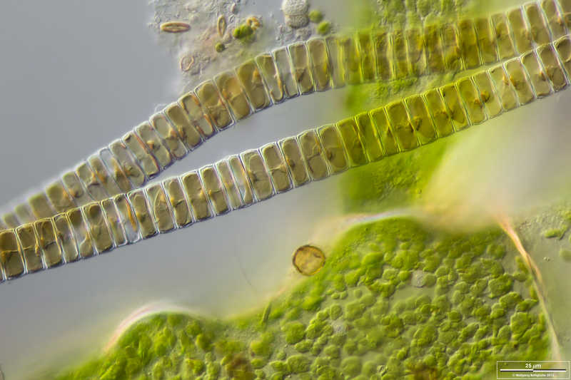 Ellerbeckia spec. mit Grünalge Caldophora. Multiebenen-Abbildung, manuell gestapelt. Der Messbalken markiert eine Länge von 25 µm.