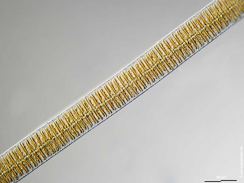 Multiebenen-Abbildung, manuell gestapelt. Der Messbalken markiert eine Länge von 50 µm. Probe aus der Nordsee vor Helgoland in der Zeit der Frühjahrsblüte. Mikrotechnik: Zeiss Axioplan Kamera: Olympus OM-D E-M5 II.Creative Commons License V 3.0 (CC BY-NC-SA).
