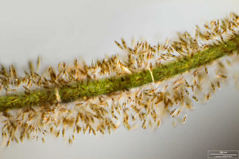 Gomphonema spec. auf der Grünalge Caldophora. Multiebenen-Abbildung, manuell gestapelt. Der Messbalken markiert eine Länge von 100 µm.