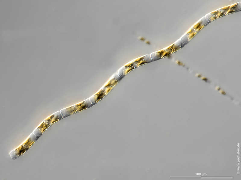 Multiebenen-Abbildung, manuell gestapelt. Der Messbalken markiert eine Länge von 100 µm. Probe aus der Kieler Förde. Datum der Aufsammlung: 4/2018. Mikrotechnik: Zeiss Axioplan, Kamera: Olympus OM-D M5 MKII. Creative Commons License V 3.0 (CC BY-NC-SA).