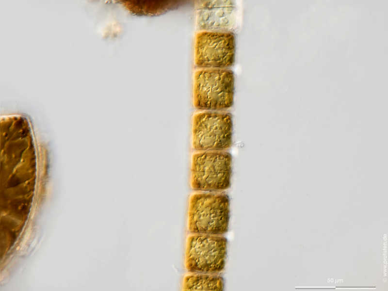 Scale bar indicates 50 µm. The image was built up using several photomicrographic frames with manual stacking technique. Sample from the Domänental pond near Kronshagen (Kiel, Germany). Images were taken using Zeiss Axioplan with Olympus OM-D M5 MKII.Image under Creative Commons License V 3.0 (CC BY-NC-SA).