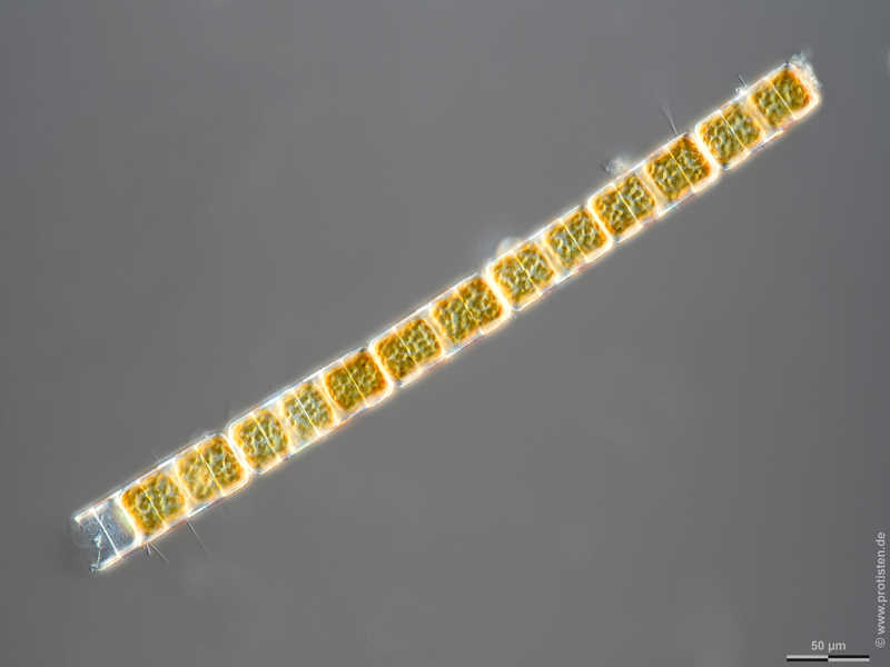 Multiebenen-Abbildung, manuell gestapelt. Der Messbalken markiert eine Länge von 50 µm. Probe aus der Kieler Förde. Datum der Aufsammlung: 1/2022. Mikrotechnik: Zeiss Axioplan, Kamera: Olympus OM-D M5 MKII. Creative Commons License V 3.0 (CC BY-NC-SA).