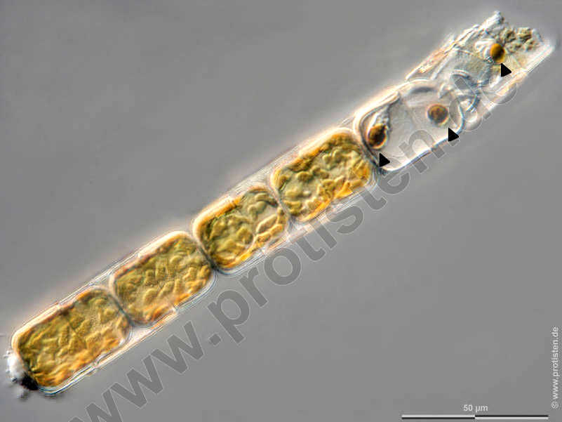 Die sexuelle Fortpflanzung zentrischer Diatomeen (Centrales) zeichnet sich durch Oogamie aus. Bei Melosira werden die Spermien in schmaleren, die Oogonien in breiteren Zellketten gebildet. In den männlichen Gametenmutterzellen (Antheridien) entstehen nach der Meiose vier eingeißelige, bewegliche Spermatozioden, in den Oogonien sterben jeweils drei Meiose-Kerne ab und nur eine befruchtungsfähige Eizelle bleibt übrig.Die Bilder zeigen die Geißel (Pfeil) sowie einen goldbraunen Chloroplasten (Doppelpfeilkopf, Farbe aufgrund des akzessorischen Farbstoffs Fucoxanthin) am Hinterende der Spermatozoiden (Pfeilkopf). Nach Krammer, K. und van den Hoek, C. Der Messbalken markiert eine Länge von 50 µm. Probe aus der Kieler Förde. Datum der Aufsammlung: 1/2022. Mikrotechnik: Zeiss Axioplan, Kamera: Olympus OM-D M5 MKII. Creative Commons License V 3.0 (CC BY-NC-SA).