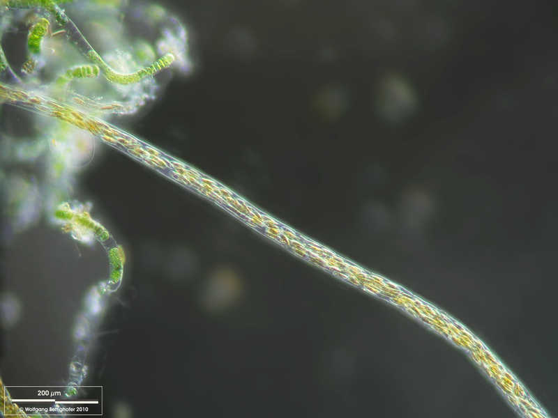 Navicula spec. in mucilaginous sheath accompanied by Ulothrix carmichaelii. Scale bar indicates 200 µm. The image was built up using several photomicrographic frames with manual stacking technique. Sample from North Sea near Heligoland (Aufwuchs). Images were taken using Zeiss Universal with Olympus C7070 CCD camera.Image under Creative Commons License V 3.0 (CC BY-NC-SA).