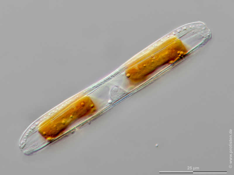 Keeled raphe, nucleus with excentric nucleolus. Please press the “MORE” button for skipping to the annotated version. Scale bar indicates 25 µm. The specimen was gathered in the Kieler Förde (Baltic Sea). Sampling date 1/2022. The image was built up using several photomicrographic frames with manual stacking technique. Images were taken using Zeiss Axioplan with Olympus OM-D M5 MKII. Image under Creative Commons License V 3.0 (CC BY-NC-SA).
