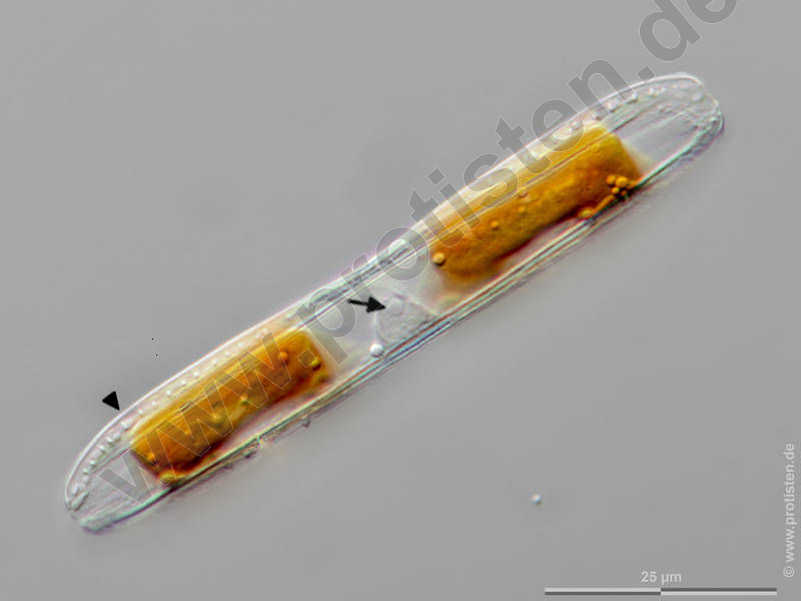 Kanalraphe (Pfeilspitze), Zellkern mit exzentrisch liegendem Nucleolus (Pfeil). Multiebenen-Abbildung, manuell gestapelt. Der Messbalken markiert eine Länge von 25 µm. The specimen was gathered in the Kieler Förde (Baltic Sea). Datum der Aufsammlung: 1/2022. Mikrotechnik: Zeiss Axioplan, Kamera: Olympus OM-D M5 MKII. Creative Commons License V 3.0 (CC BY-NC-SA).