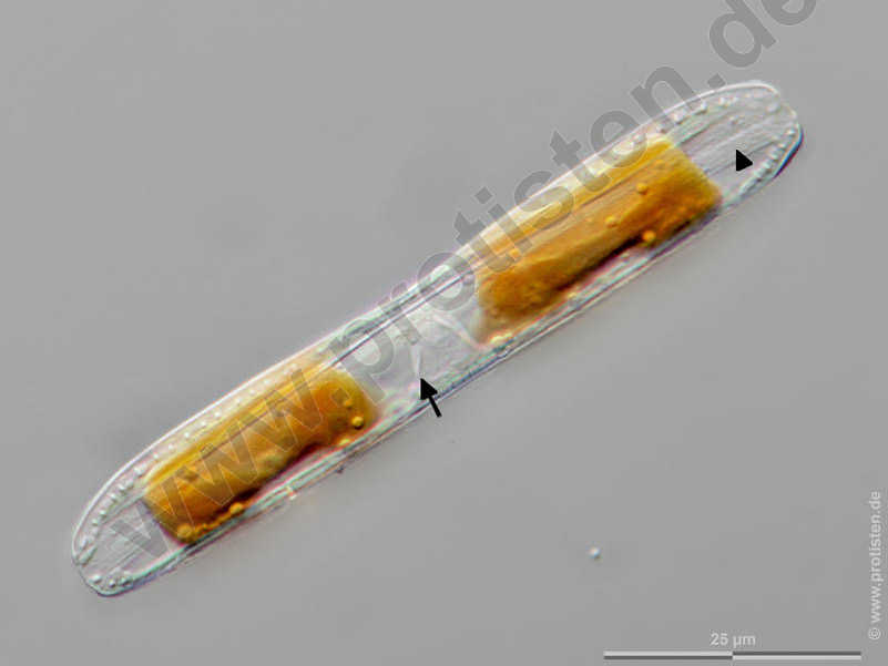 Gürtelband (Pfeilspitze), Cytoplasmahülle um den Zellkern (Pfeil). Multiebenen-Abbildung, manuell gestapelt. Der Messbalken markiert eine Länge von 25 µm. The specimen was gathered in the Kieler Förde (Baltic Sea). Datum der Aufsammlung: 1/2022. Mikrotechnik: Zeiss Axioplan, Kamera: Olympus OM-D M5 MKII. Creative Commons License V 3.0 (CC BY-NC-SA).