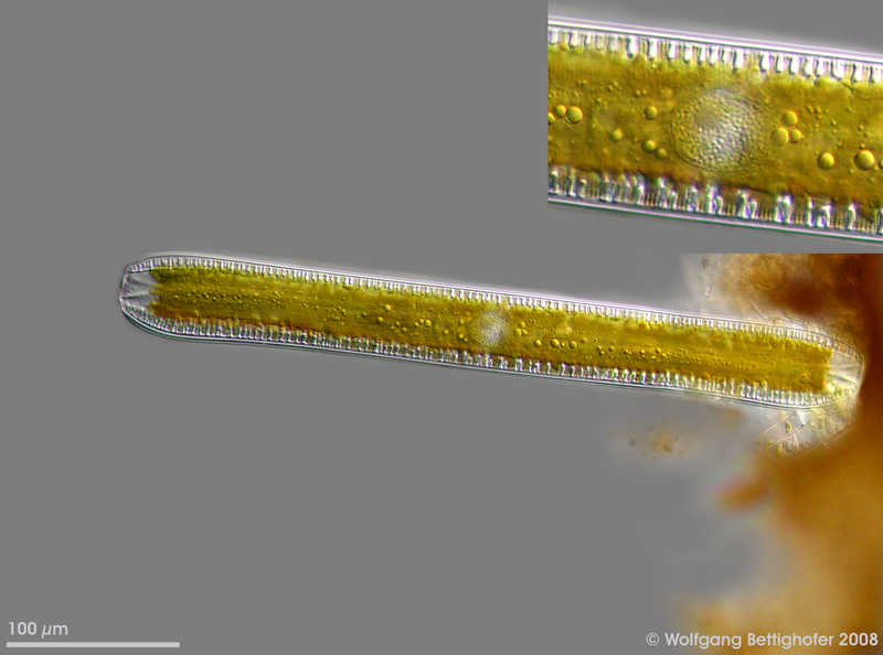 Nitzschia spec. mit sehr großen Zellen. Die vergrößerten Bildausschnitte zeigen die Kielbögen der Kanalraphe und den Zellkern mit der stark hervortretenden granulösen Struktur des Karyoplasmas, wie es für Kerne von Diatomeen typisch ist. Multiebenen-Abbildung, manuell gestapelt. Der Messbalken markiert eine Länge von 100 µm. Probe aus einen Kleingewässer auf Hiddensee. Mikrotechnik: Zeiss Universal, Kamera: Olympus C7070.Creative Commons License V 3.0 (CC BY-NC-SA).