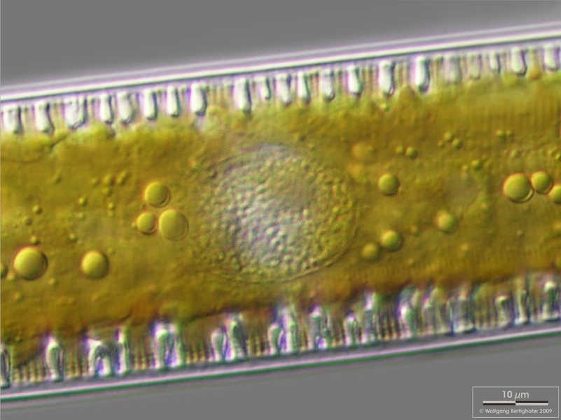 Zoom on the nucleus of Nitzschia with nucleolus and the chromatine structure typical for diatom nuclei. Scale bar indicates 10 µm. The specimen was gathered in a tiny freshwater pond at the island of Hiddensee (Baltic Sea, Germany) which shows a fascinating biodiversity of naked and testate amoebae. Images were taken using Zeiss Standard with Olympus C7070 CCD camera.Image under Creative Commons License V 3.0 (CC BY-NC-SA).