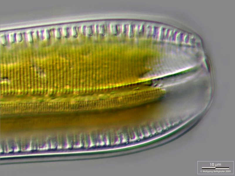 Ausschnittsvergrößerung der Kielbögen der Kanalraphe von Nitzschia spec. in Gürtelbandansicht. Multiebenen-Abbildung, manuell gestapelt. Der Messbalken markiert eine Länge von 10 µm. Probe aus einen Kleingewässer auf Hiddensee. Mikrotechnik: Zeiss Universal, Kamera: Olympus C7070.Creative Commons License V 3.0 (CC BY-NC-SA).