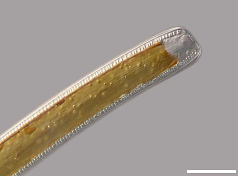 Detail: Apex in cingular view, displaying cingulum (central strae and the two canal raphes on the edges. Scale bar indicates 25 µm. Sample from a wetland at the Pillersee (Tyrol, Austria). The image was built up using several photomicrographic frames with manual stacking technique. Images were taken using Zeiss Universal with Olympus C7070 CCD camera. Image under Creative Commons License V 3.0 (CC BY-NC-SA).