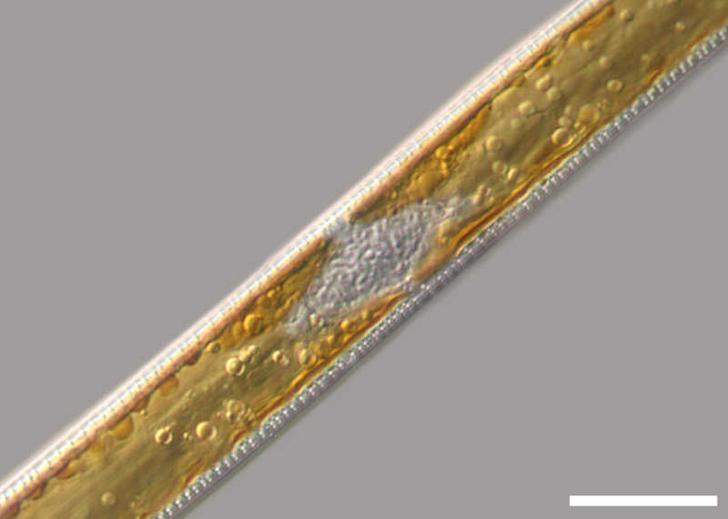 Detail: Center of the cell in cingular view with nucleus, cloroplasts with oil droplets (energy store) and the canal raphes. Scale bar indicates 25 µm. Sample from a wetland at the Pillersee (Tyrol, Austria). The image was built up using several photomicrographic frames with manual stacking technique. Images were taken using Zeiss Universal with Olympus C7070 CCD camera. Image under Creative Commons License V 3.0 (CC BY-NC-SA).