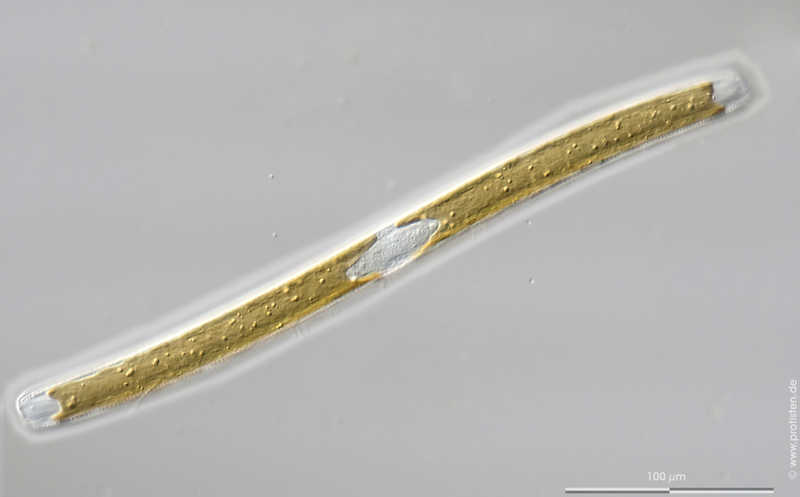 Gürtelbandansicht. Multiebenen-Abbildung, manuell gestapelt. Der Messbalken markiert eine Länge von 100 µm. Probe aus dem Domänentalteich bei Kronshagen. Mikrotechnik: Zeiss Axioplan, Kamera: Olympus OM-D M 5 MKII. Creative Commons License V 3.0 (CC BY-NC-SA).