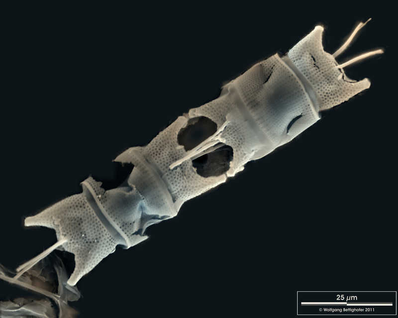 Der Messbalken markiert eine Länge von 25 µm. Probe aus der Nordsee vor Helgoland in der Zeit der Frühjahrsblüte. Die Aufnahme entstand im Labor Dr. Karl-Heinz Schäffner, Solingen.Creative Commons License V 3.0 (CC BY-NC-SA).