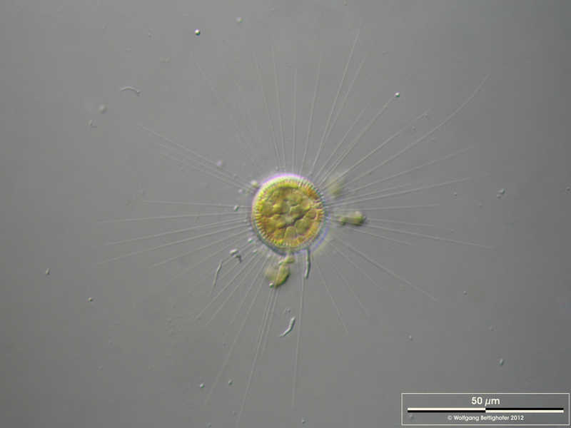 The thin, barely visible floating extensions are made of chitin. Scale bar indicates 50 µm. The specimen was gathered in the wetlands of national park Unteres Odertal (100 km north east of Berlin). The image was built up using several photomicrographic frames with manual stacking technique. Images were taken using Zeiss Universal with Olympus C7070 CCD camera. Image under Creative Commons License V 3.0 (CC BY-NC-SA).