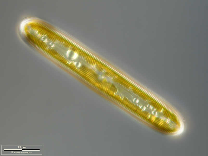 Schalenansicht. Multiebenen-Abbildung, manuell gestapelt. Der Messbalken markiert eine Länge von 25 µm. Probe aus dem Pillersee in Tirol. Mikrotechnik: Zeiss Universal, Kamera: Olympus C7070. Creative Commons License V 3.0 (CC BY-NC-SA).