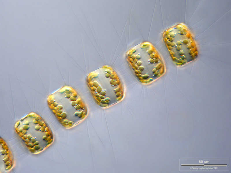 Chain of Porosira glacialis. Note that the delicate spines are chitinous. Focus on frustule surface. Scale bar indicates 50 µm. The image was built up using several photomicrographic frames with manual stacking technique.