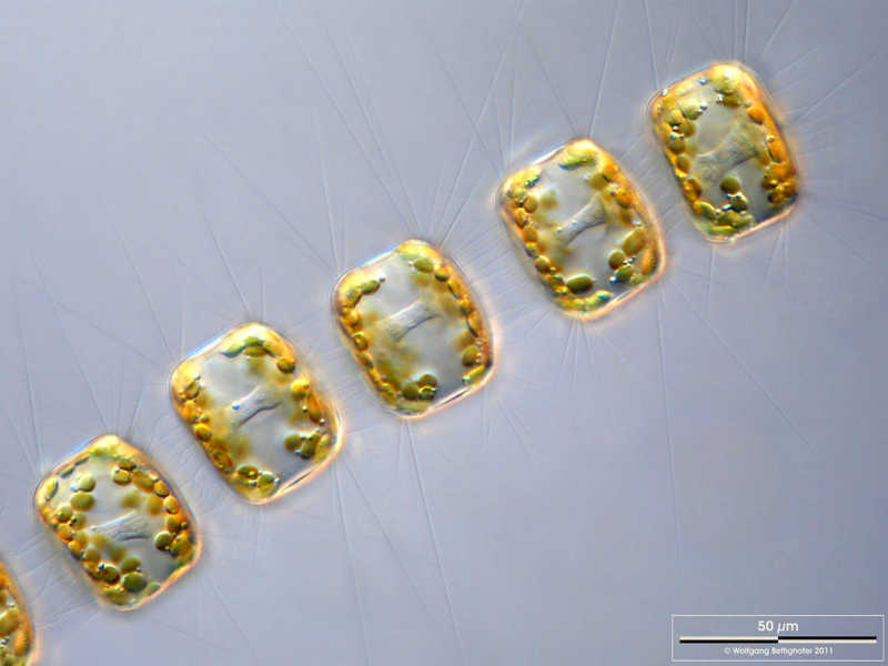 Chain of Porosira glacialis. Note that the delicate spines are chitinous. Focus on cell center showing cytoplasmic accumulation around the nucleus. Scale bar indicates 50 µm. The image was built up using several photomicrographic frames with manual stacking technique.