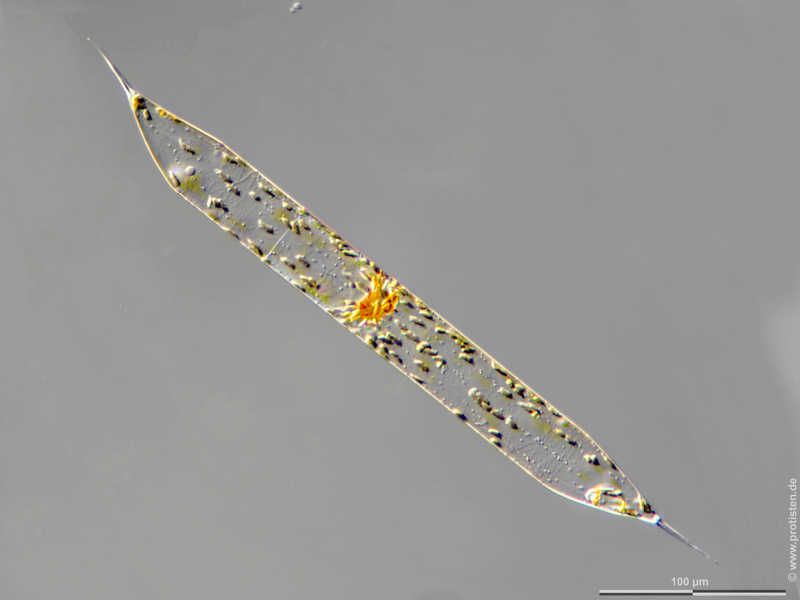 Segmentation of the girdle bands, single chloroplast, numerous chloroplasts surrounding and thus hiding the nucleus for protection against harmful UV radiation.Please press the “MORE” button for skipping to the annotated version. Scale bar indicates 100 µm. The specimen was gathered in the Kieler Förde (Baltic Sea). Sampling date 1/2022. The image was built up using several photomicrographic frames with manual stacking technique. Images were taken using Zeiss Axioplan with Olympus OM-D M5 MKII. Image under Creative Commons License V 3.0 (CC BY-NC-SA).