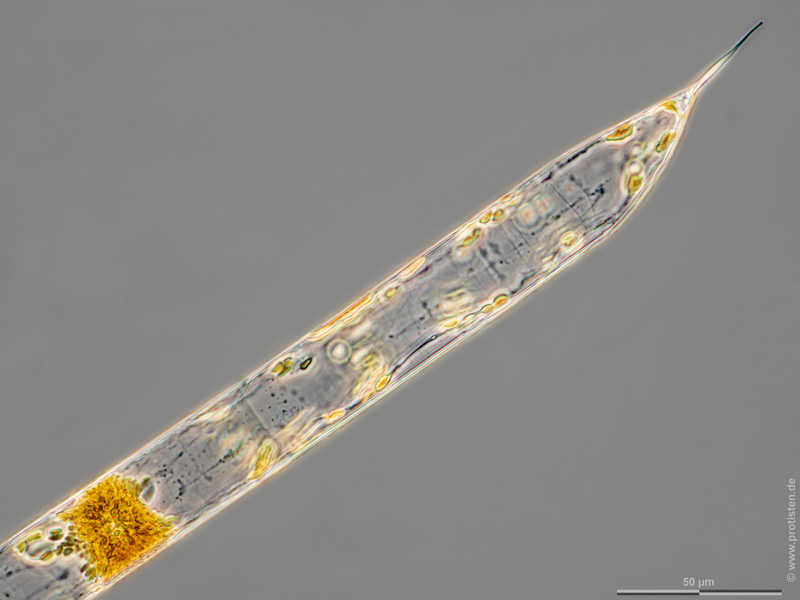 Der Phasenkontrast zeigt Zytoplasmastränge, welche die Zellorganellen wie Chloroplasten, Zellkern, Mitochondrien usw. umhüllen. Bitte drücken Sie die Schaltfläche „MORE“, um zur kommentierten Version zu gelangen. Multiebenen-Abbildung, manuell gestapelt. Der Messbalken markiert eine Länge von 50 µm. Probe aus der Kieler Förde. Datum der Aufsammlung: 1/2022. Mikrotechnik: Zeiss Axioplan, Kamera: Olympus OM-D M5 MKII. Creative Commons License V 3.0 (CC BY-NC-SA).