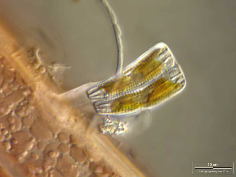 Rhoicosphenia abbreviata is a tiny araphid desmid living attached on substratum by a jelly stalk. Scale bar indicates 10 µm. Collected from Bodden, the brackish waters lying between the isles of Hiddensee and Ruegen (German Baltic Sea). This image was taken using Zeiss Universal with Olympus C7070 CCD camera. Image under Creative Commons License V 3.0 (CC BY-NC-SA).
