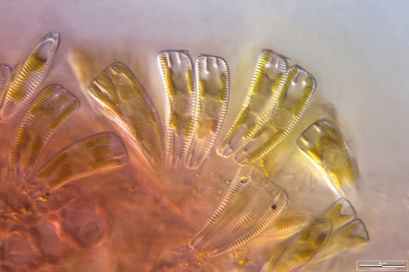 Rhoicosphenia abbreviata als Aufwuchs auf der Rotalge Ceramium. Multiebenen-Abbildung, manuell gestapelt. Der Messbalken markiert eine Länge von 10 µm. Probe aus dem Hiddenseer Bodden. Mikrotechnik: Zeiss Universal, Kamera: Olympus C7070.Creative Commons License V 3.0 (CC BY-NC-SA).