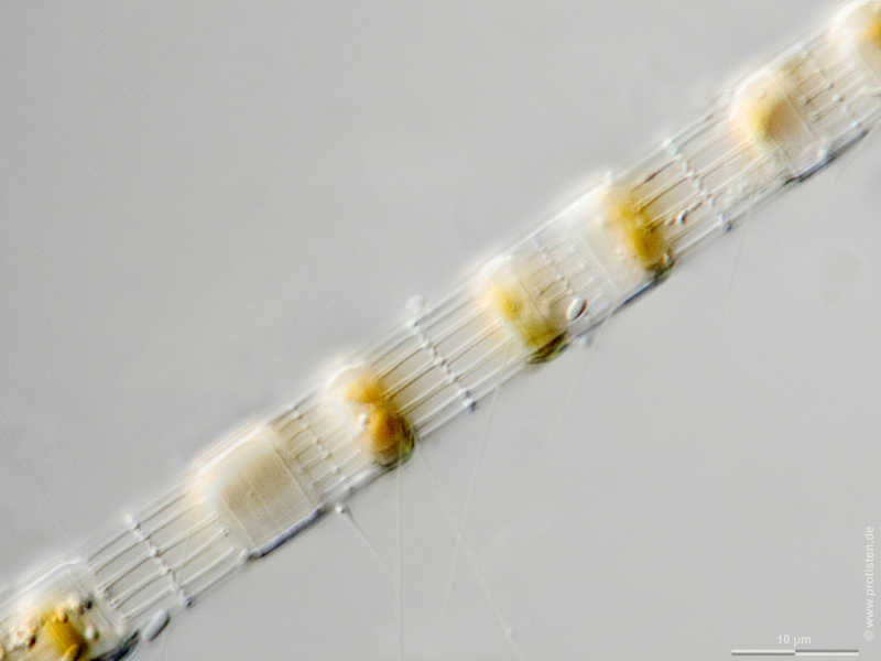 Multiebenen-Abbildung, manuell gestapelt. Der Messbalken markiert eine Länge von 10 µm. Probe aus der Kieler Förde. Datum der Aufsammlung: 1/2022. Mikrotechnik: Zeiss Axioplan, Kamera: Olympus OM-D M5 MKII. Creative Commons License V 3.0 (CC BY-NC-SA).
