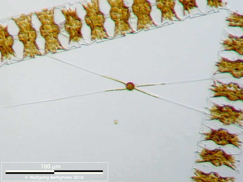 Schalenansicht, eingerahmt von einer Odontella-Kette. Multiebenen-Abbildung, manuell gestapelt. Der Messbalken markiert eine Länge von 100 µm. Probe aus der Nordsee vor Helgoland in der Zeit der Frühjahrsblüte. Mikrotechnik: Zeiss Universal, Kamera: Olympus C7070.Creative Commons License V 3.0 (CC BY-NC-SA).