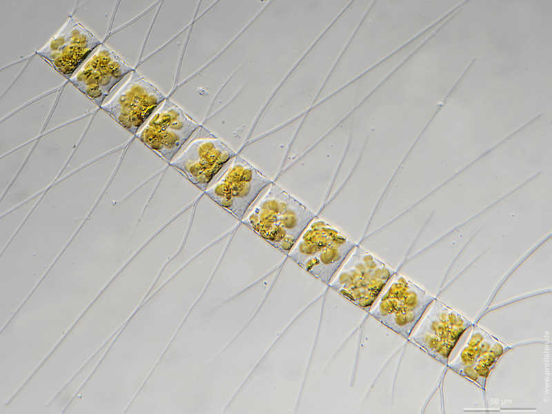 Multiebenen-Abbildung, manuell gestapelt. Der Messbalken markiert eine Länge von 50 µm. Probe aus der Kieler Förde in der Zeit der Frühjahrsblüte. Mikrotechnik: Zeiss Axioplan Kamera: Olympus OM-D E-M5 MKII.Creative Commons License V 3.0 (CC BY-NC-SA).