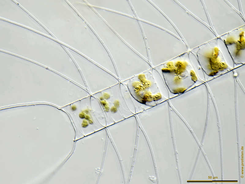 Multiebenen-Abbildung, manuell gestapelt. Der Messbalken markiert eine Länge von 50 µm. Probe aus der Kieler Förde. Datum der Aufsammlung: 4/2018. Mikrotechnik: Zeiss Axioplan, Kamera: Olympus OM-D M5 MKII. Creative Commons License V 3.0 (CC BY-NC-SA).