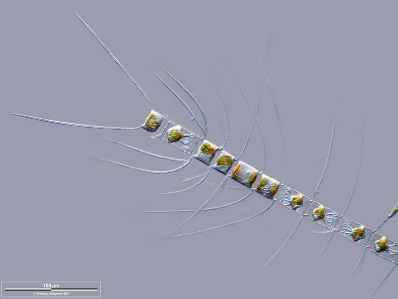 Sample from North Sea near Heligoland (spring diatom bloom). The image was built up using several photomicrographic frames with manual stacking technique. Images were taken using Zeiss Universal with Olympus C7070 CCD camera.