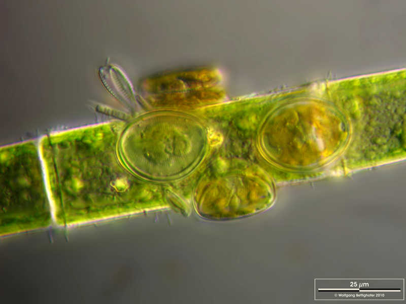 Cocconeis pediculus auf der Grünalge Oedogonium spec. Des Weiteren sind fädige Kolonien der Blaualge Homeothrix spec. zu sehen. Der Messbalken markiert eine Länge von 25 µm. Probe aus dem Bodensee bei Bodman. Mikrotechnik: Zeiss Universal, Kamera: Olympus C7070.Creative Commons License V 3.0 (CC BY-NC-SA).