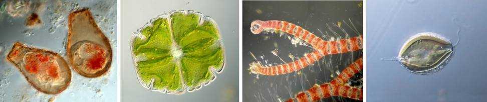 | Ein Bild sagt ja bekanntlich mehr als 1000 Worte. Deshalb sind oben typische Vertreter dieser (informellen) Organismengruppe dargestellt: zwei Schalenamöben, eine Zieralge, eine Rotalge und eine mittels Geißelschlag bewegliche Goldalge. Sie benötigen allesamt Wasser als Lebensumgebung und sind meist mikroskopisch klein. Bis kurz vor der letzten Jahrtausendwende stand der Begriff "Protisten" in der biologischen Taxonomie für ein Reich der einzellig organisierten Eukaryoten (Lebewesen mit Zellkern), parallel zu den Reichen der Tiere, der Pflanzen, der Pilze und der Prokaryoten (Lebewesen ohne Zellkern: Archaeen, Bakterien und Blaualgen). Einen Überblick über dieses Konzept enthält das Werk "Die fünf Reiche der Organismen" von Lynn Margulis und Karlene V. Schwartz, Spektrum der Wissenschaft, Heidelberg, 1989. Inzwischen hat die Molekularbiologie gezeigt, dass die stammesgeschichtlichen Verhältnisse deutlich komplizierter sind. Eine umfassende Einführung in die heutige Sicht der Phylogenie liefert das wissenschaftliche Lehrbuch "Biodiversität und Erdgeschichte" von Jens Boenigk und Sabina Wodniok, Springer-Verlag Berlin, 2014. Der informelle Begriff "Protist" ist aber weiterhin hilfreich, um die Gruppe der einzellig organisierten Lebewesen, ob mit Zellkern (Eukaryoten) oder ohne (Prokaryoten), zusammenzufassen. Ein paar kennzeichnende Eigenschaften: